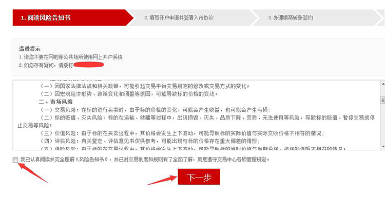 (1)进入文交所注册页面,仔细阅读《风险告知书》并在方块