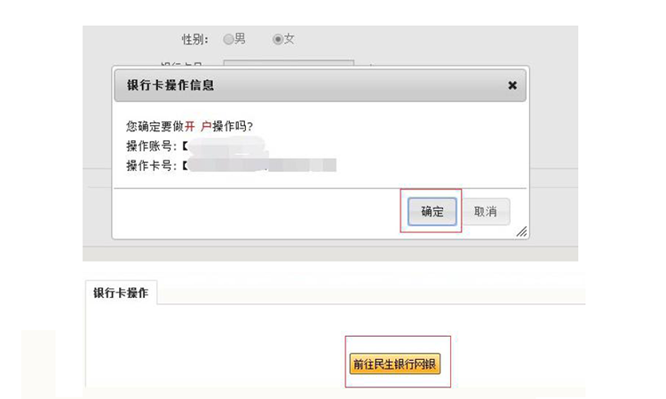 ②进入民生银行页面进行绑卡操作,填写绑定银行卡的支行和手