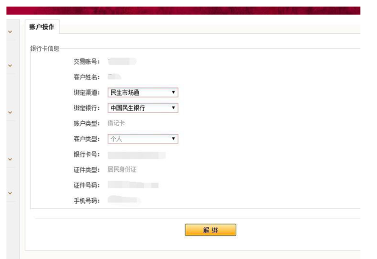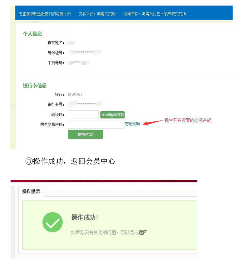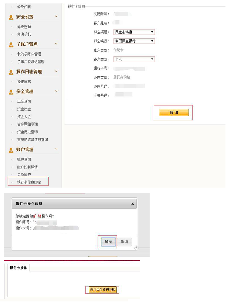 证码,点击“确定”(民生交易密码用于市场通账户解绑)