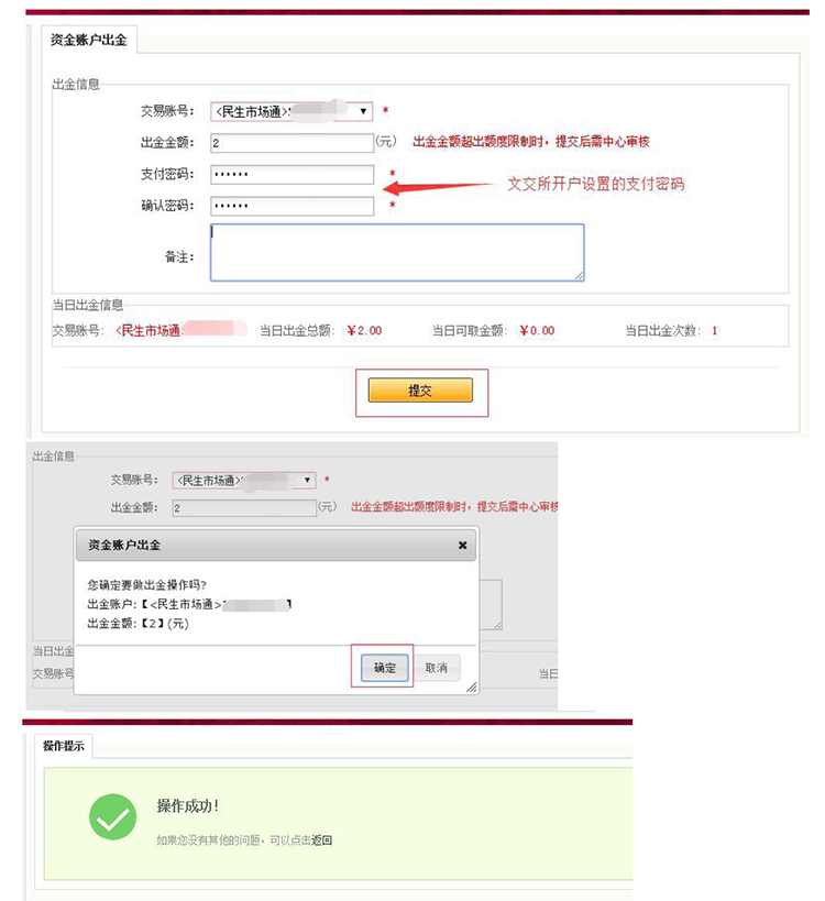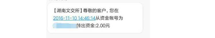 出金成功后,文交所会有通知短信发送到客户的开户手机号上,
