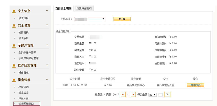 管理”-“资金明细查询”里面查询到入金和账户资金状况